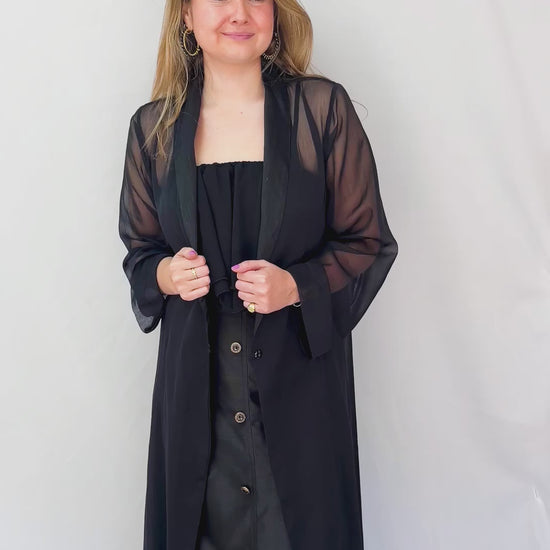 Este kimono largo de gasa es la prenda perfecta para elevar cualquier outfit de matrimonio o evento formal. Con un elegante cuello tipo solapa y caída fluida, aporta sofisticación y movimiento a tu look.