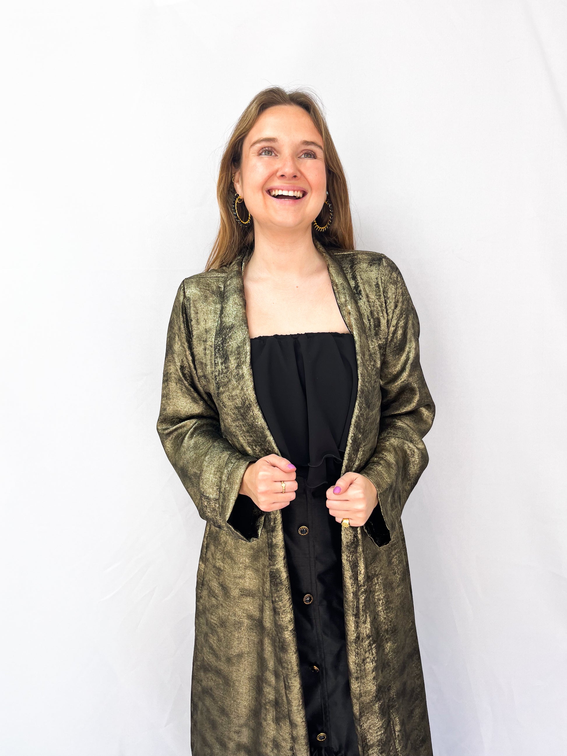 Nuestro kimono Metalizado es la pieza perfecta para elevar cualquier look. Diseñado en un tono dorado oscuro brillante con acabado satinado, aporta un toque de sofisticación y glamour a tus outfits de fiesta y looks para matrimonio.