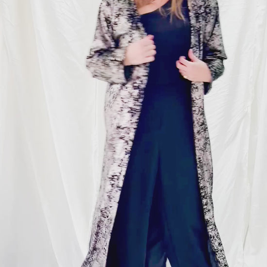 Este Kimono de Terciopelo negro con efecto martillado plateado es una prenda única. Perfecto para quienes buscan un look sofisticado, distinto y versátil, ideal tanto para eventos formales como para elevar un outfit diario con estilo.