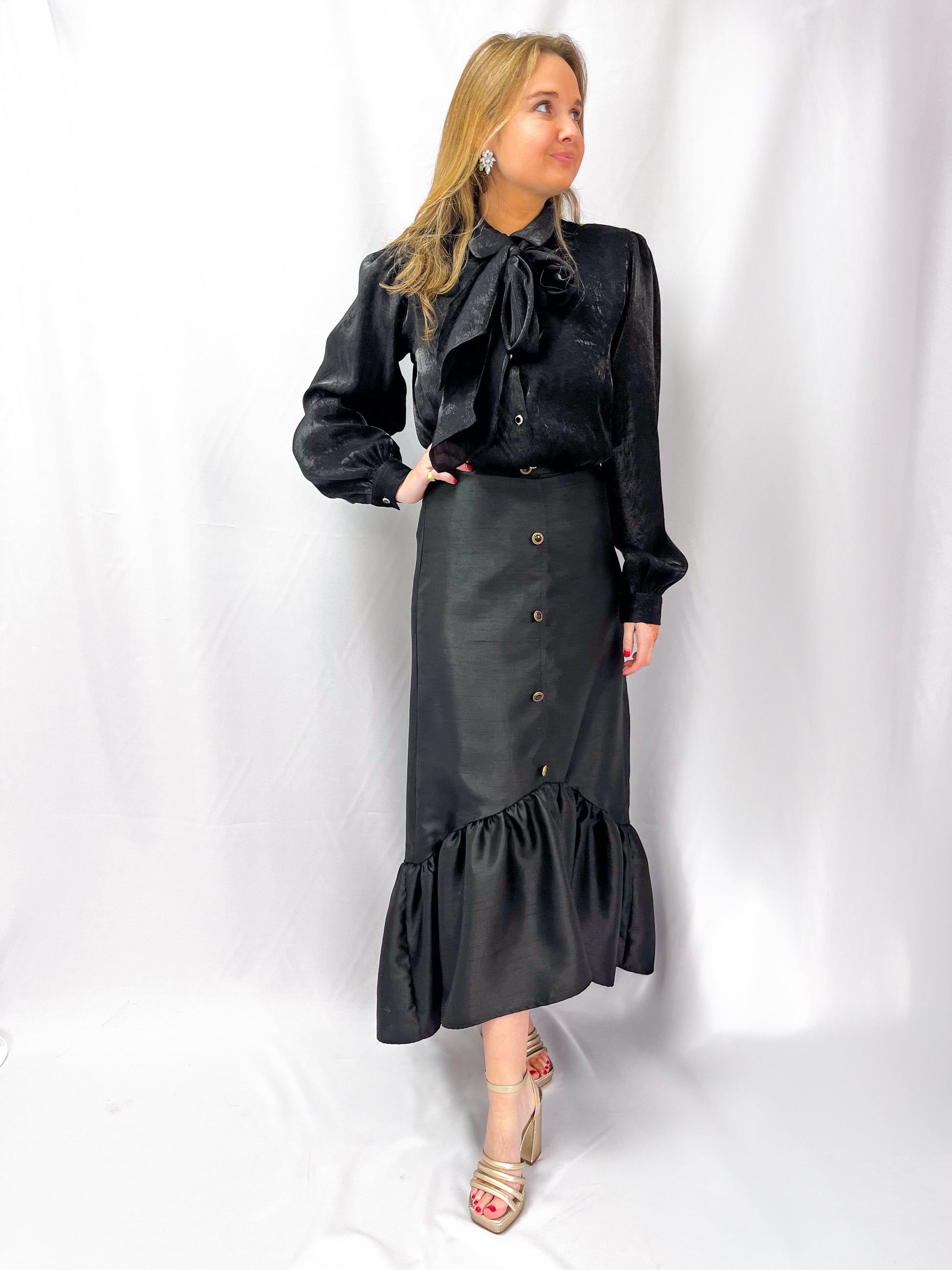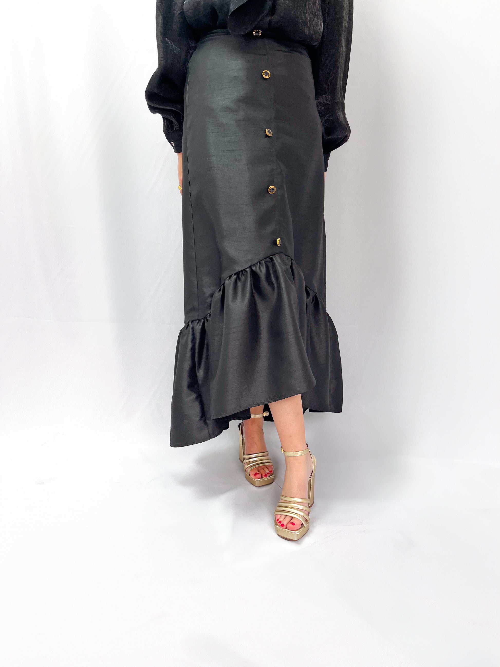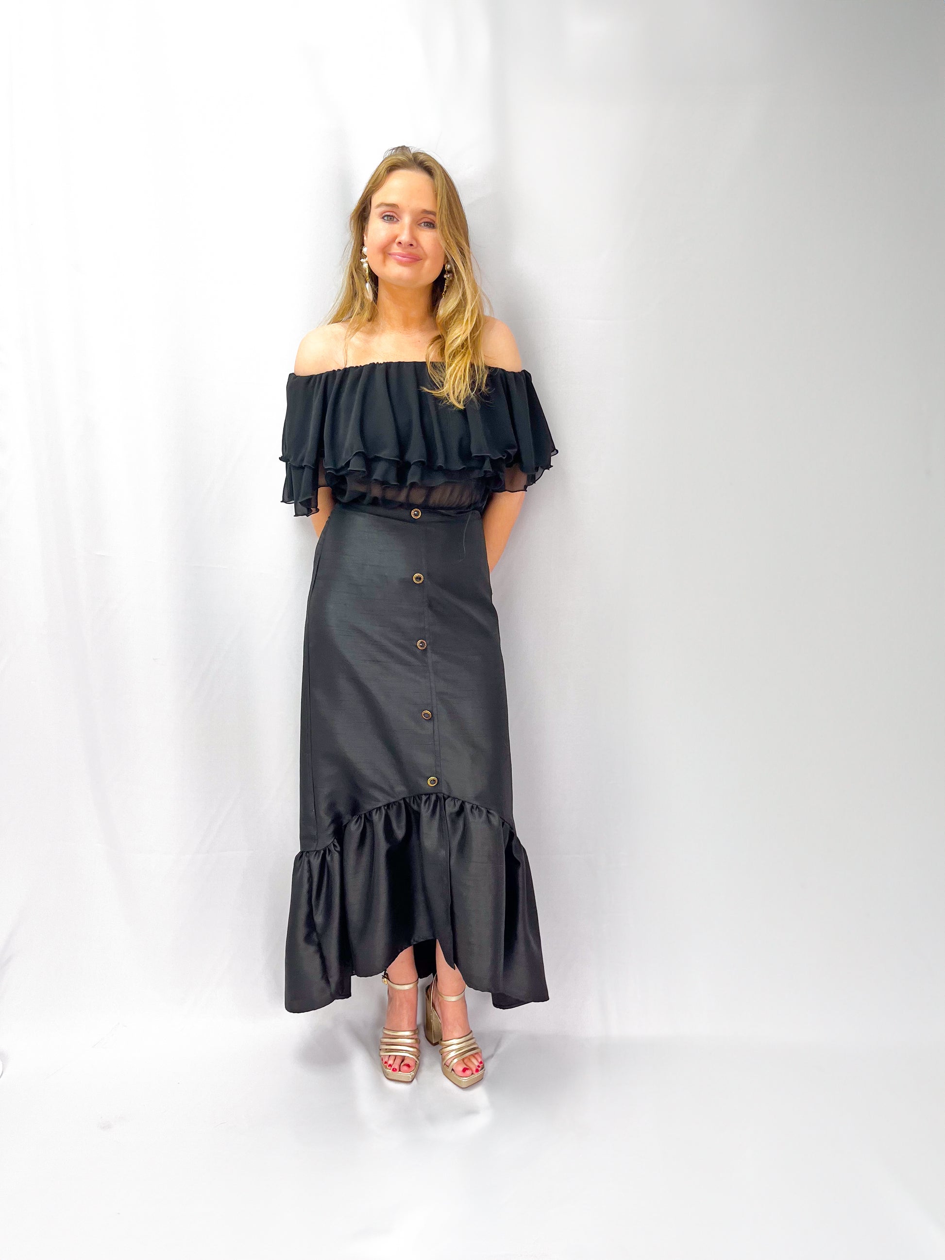 Esta pollera está pensada para mujeres auténticas, seguras de sí mismas y que valoran el diseño. Es ideal para combinar con blusas de organza, tops de seda o chaquetas cortas para un look de impacto.