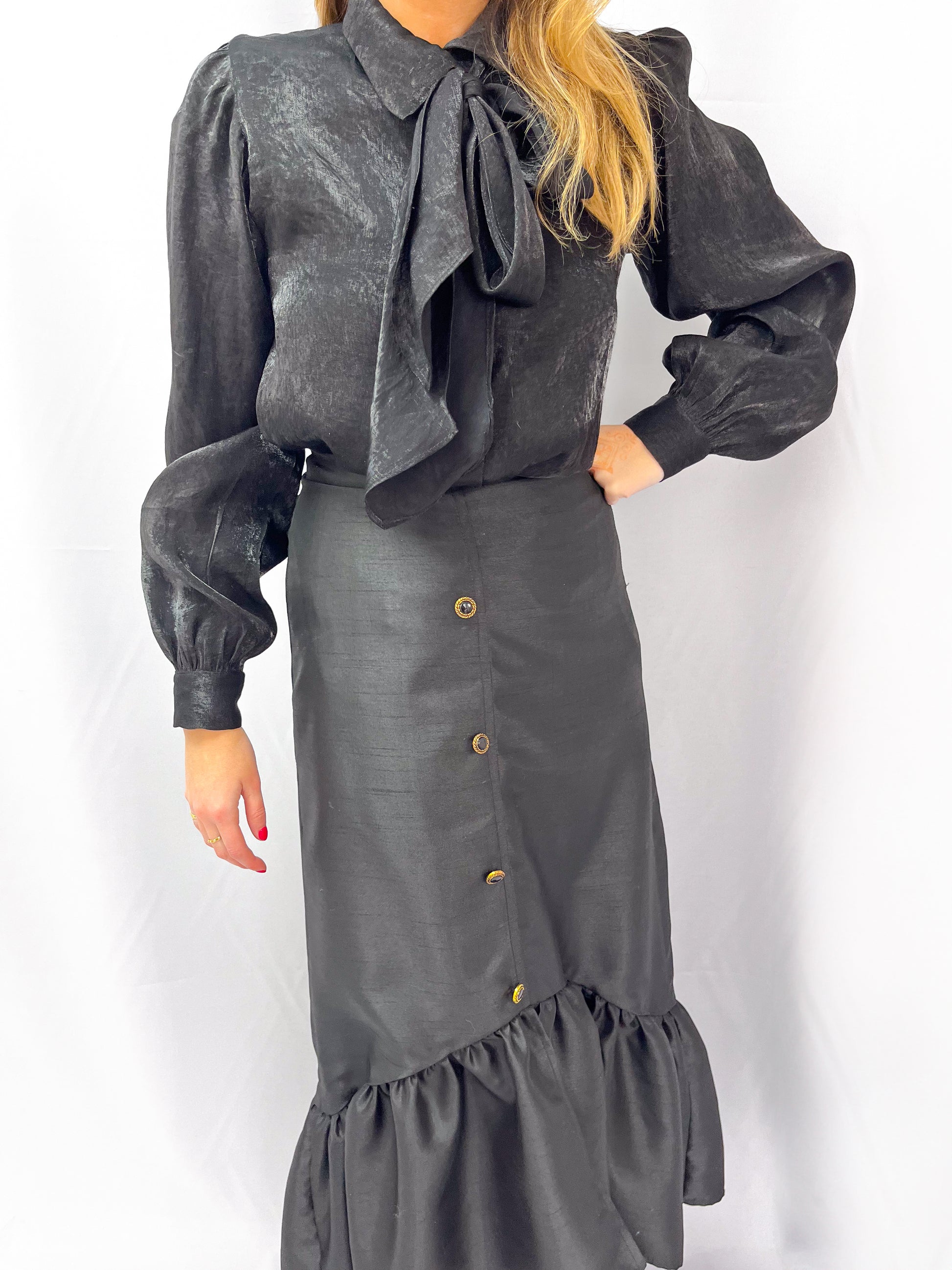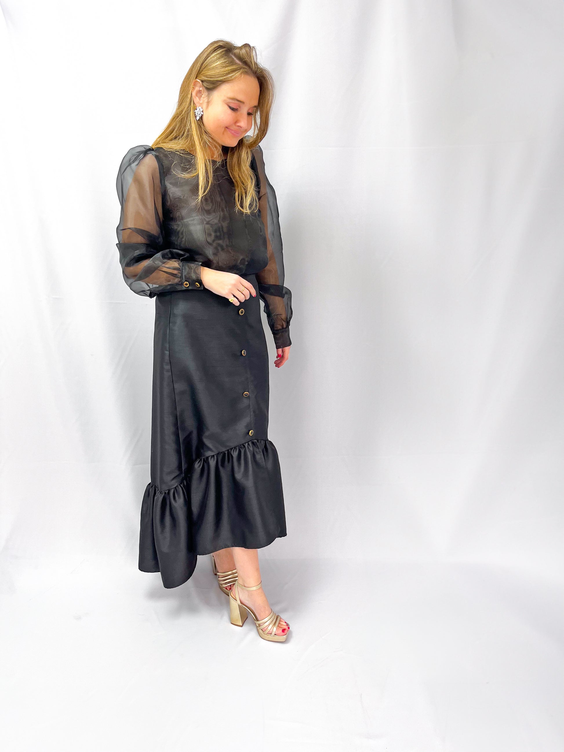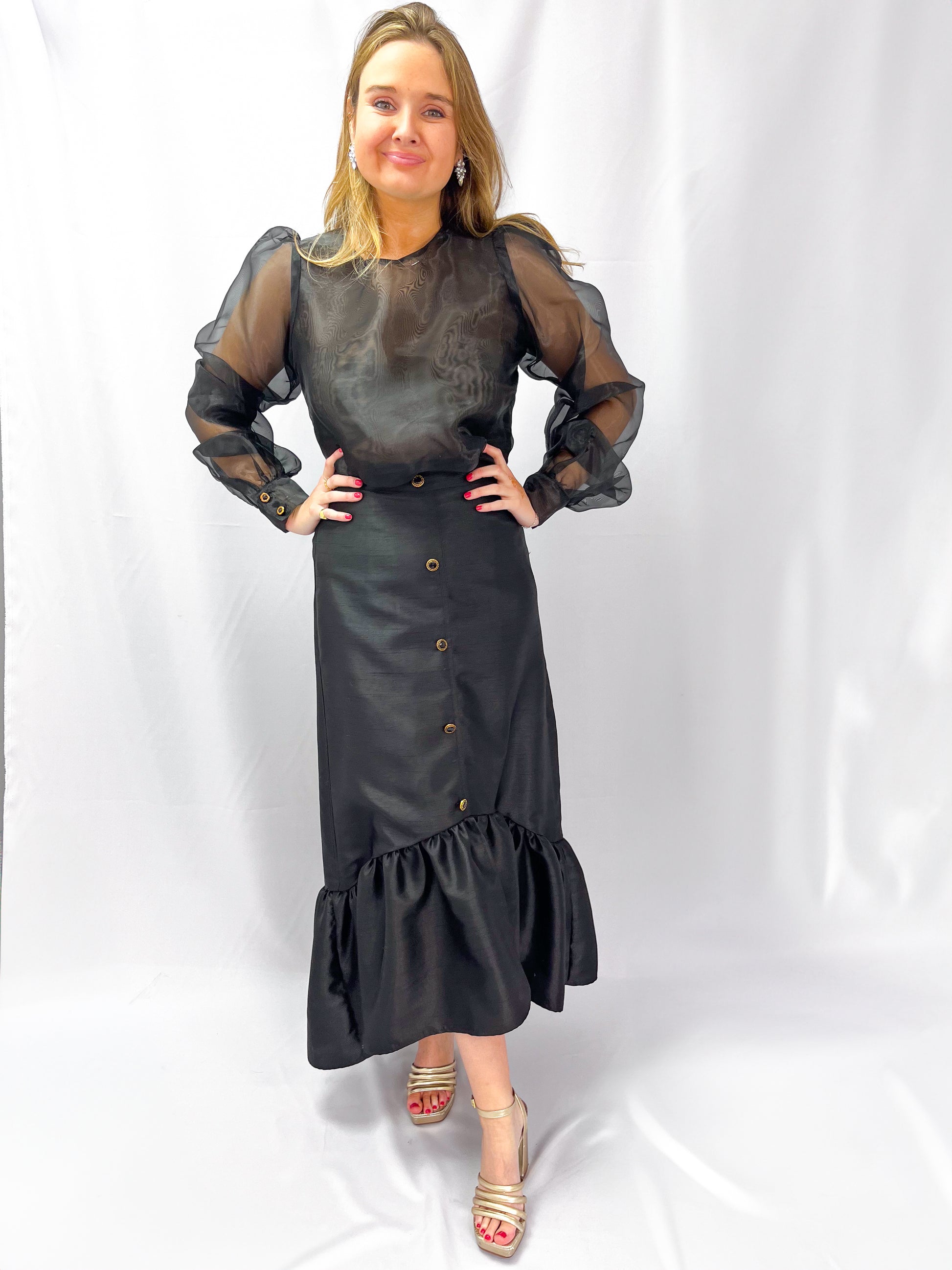 Esta pollera está pensada para mujeres auténticas, seguras de sí mismas y que valoran el diseño. Es ideal para combinar con blusas de organza, tops de seda o chaquetas cortas para un look de impacto.