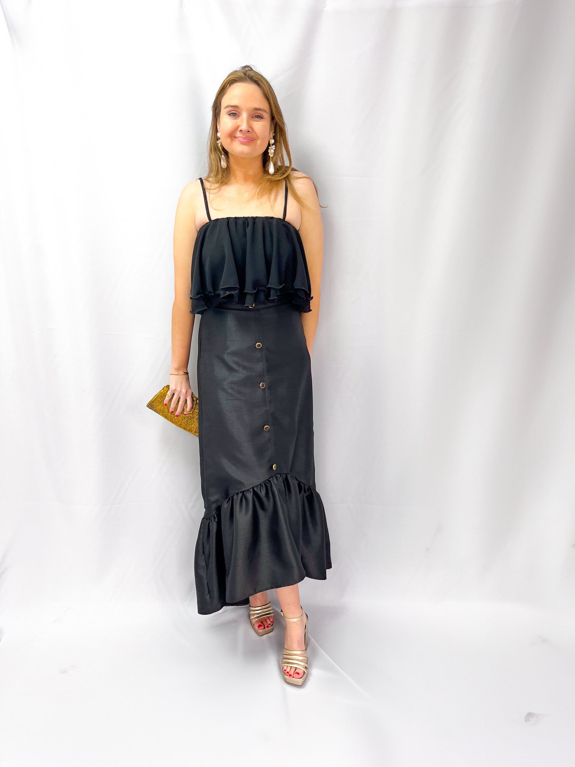La Pollera Viena es una pieza única que mezcla elegancia clásica y femenina. Su silueta larga estiliza visualmente, mientras su vuelito en la basta aporta movimiento y delicadeza. La botonadura dorada al frente le da un toque elegante.