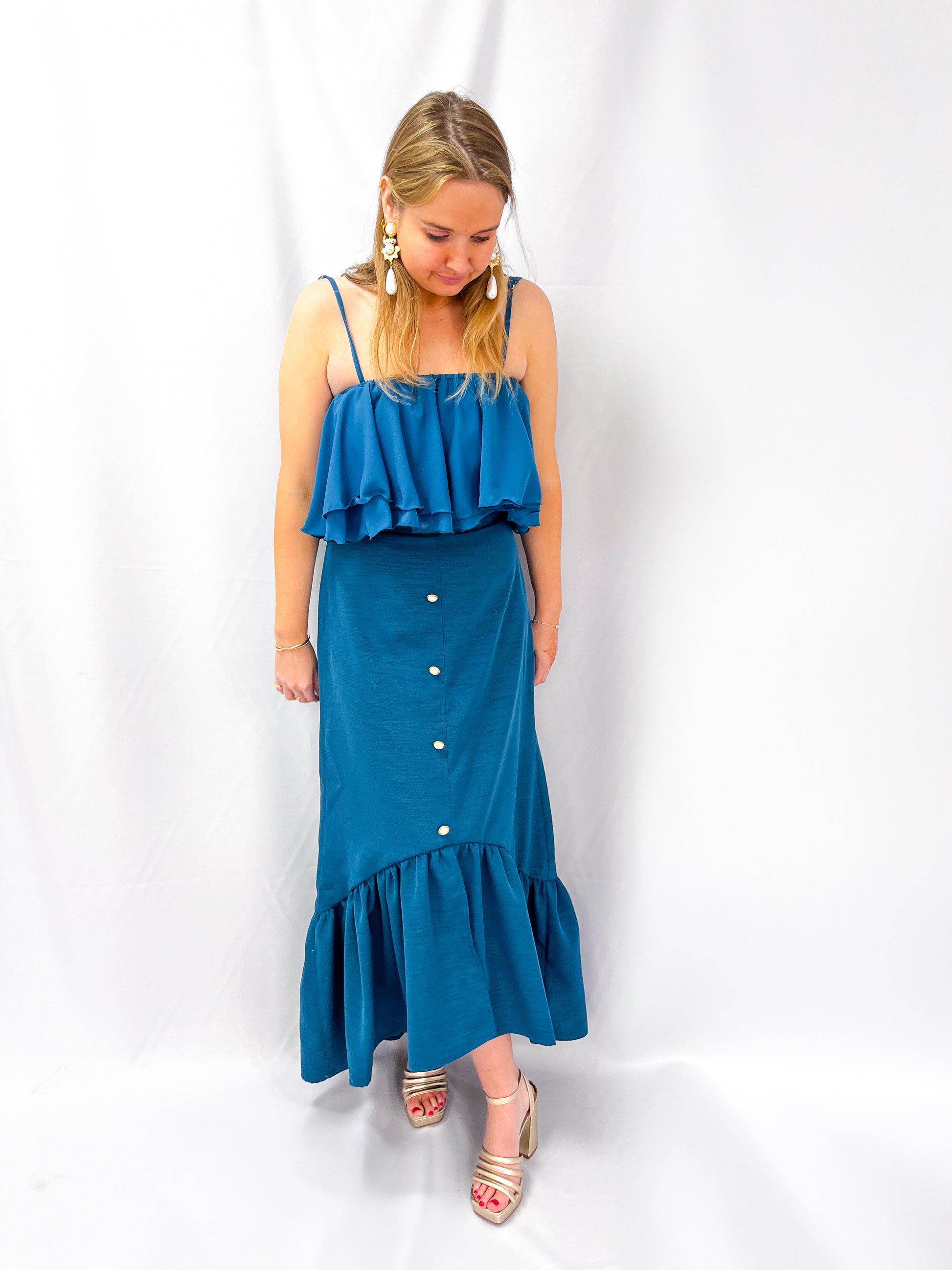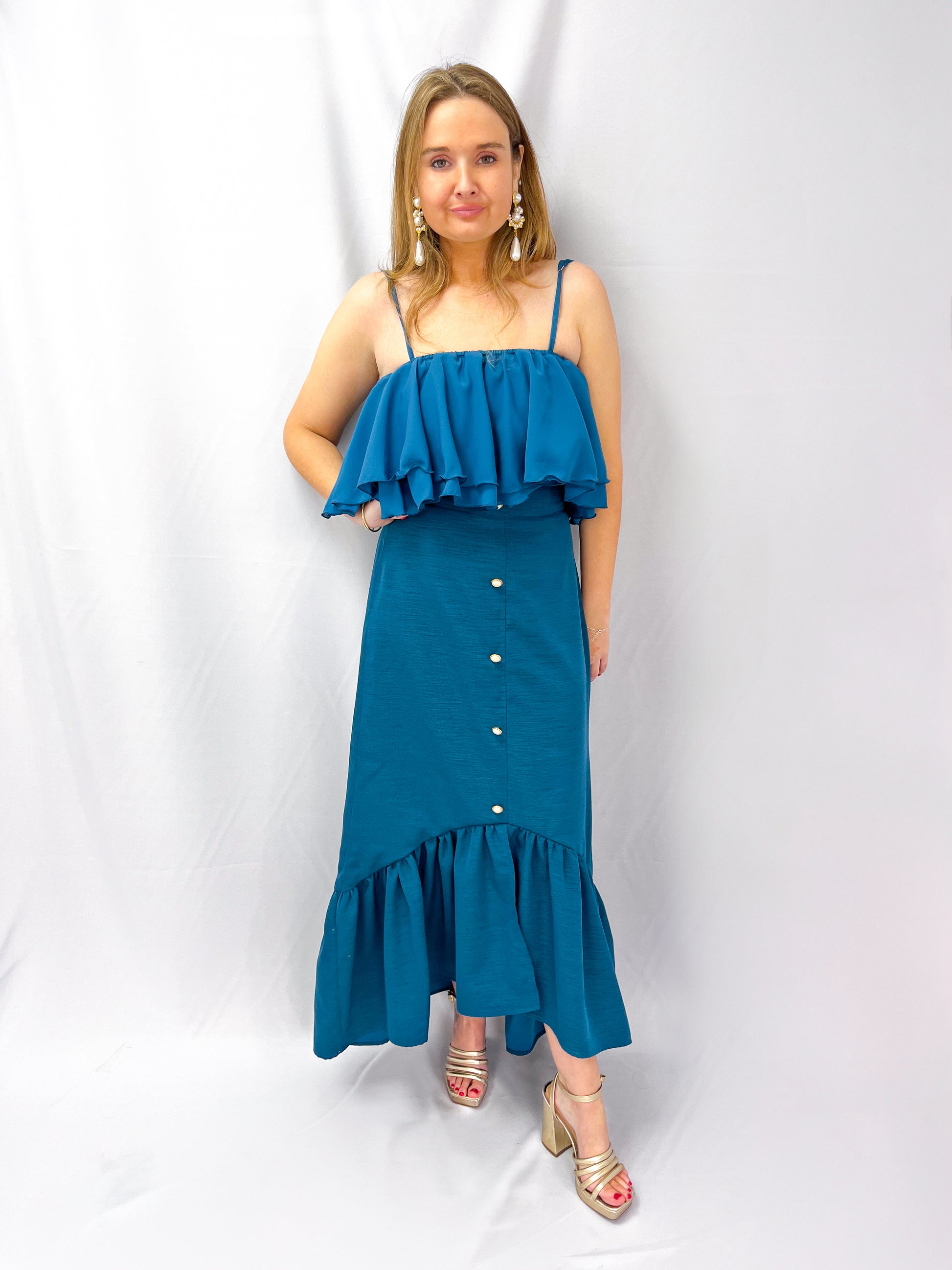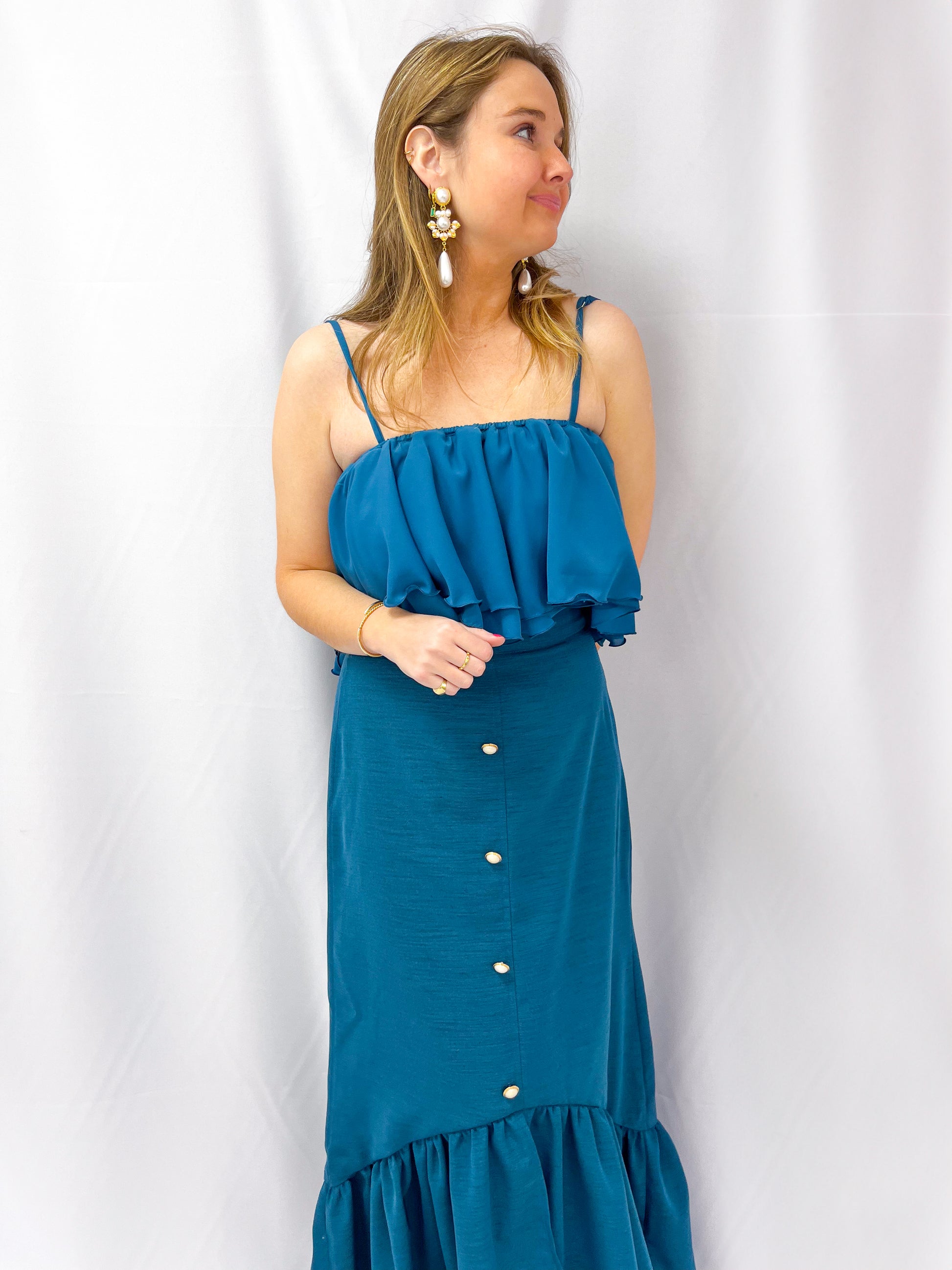 El Top Viena de Lala Herrera es la pieza perfecta para crear looks llenos de color, estilo y movimiento. Confeccionado en un tono turquesa, este top con volante amplio y tirantes finos es ideal para mujeres que buscan destacar con un look elegante y moderno.