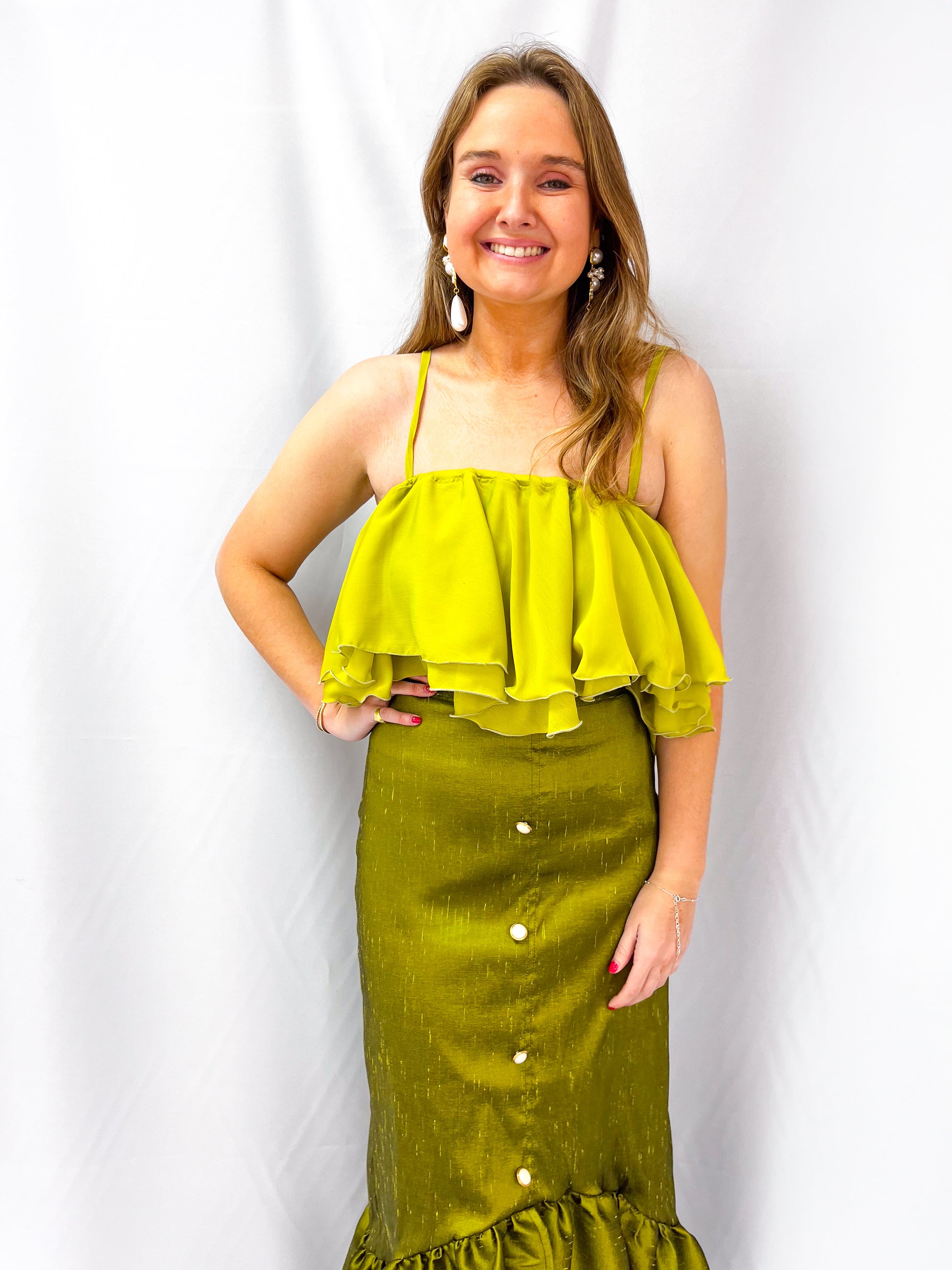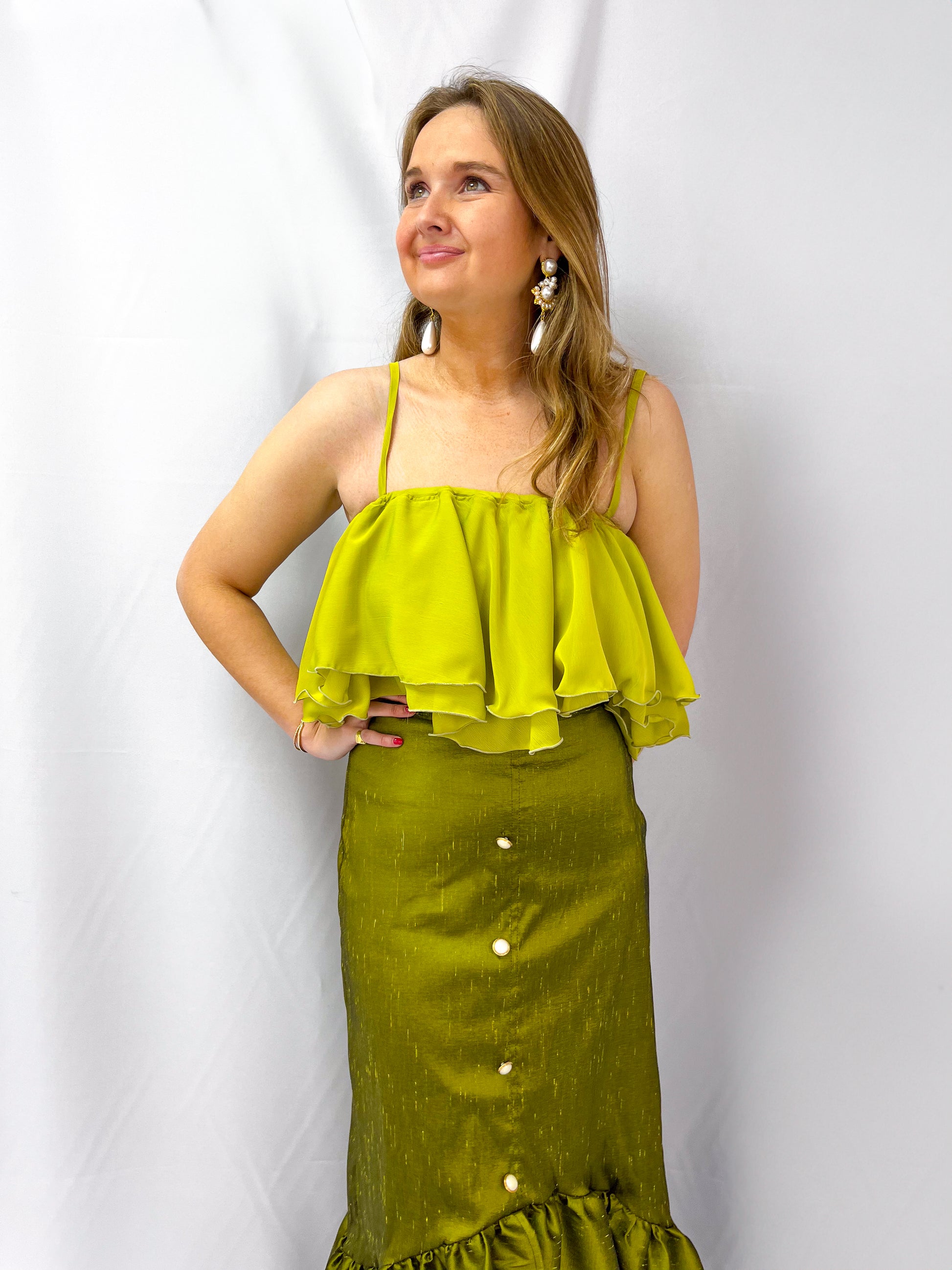 El Top Viena de Lala Herrera es la pieza perfecta para crear looks llenos de color, estilo y movimiento. Confeccionado en un tono verde limón, este top con volante amplio y tirantes finos es ideal para mujeres que buscan destacar con un look elegante y moderno.
