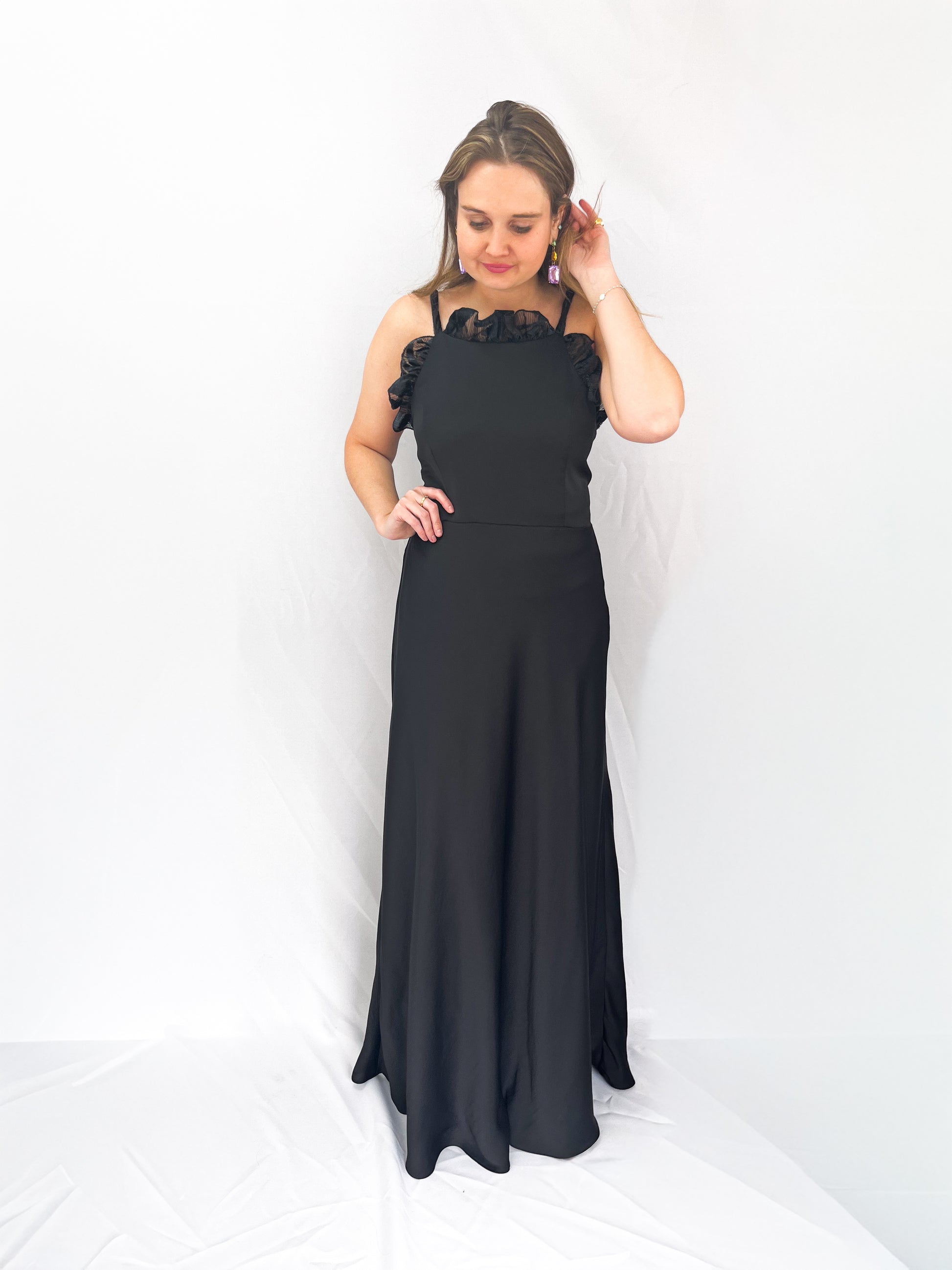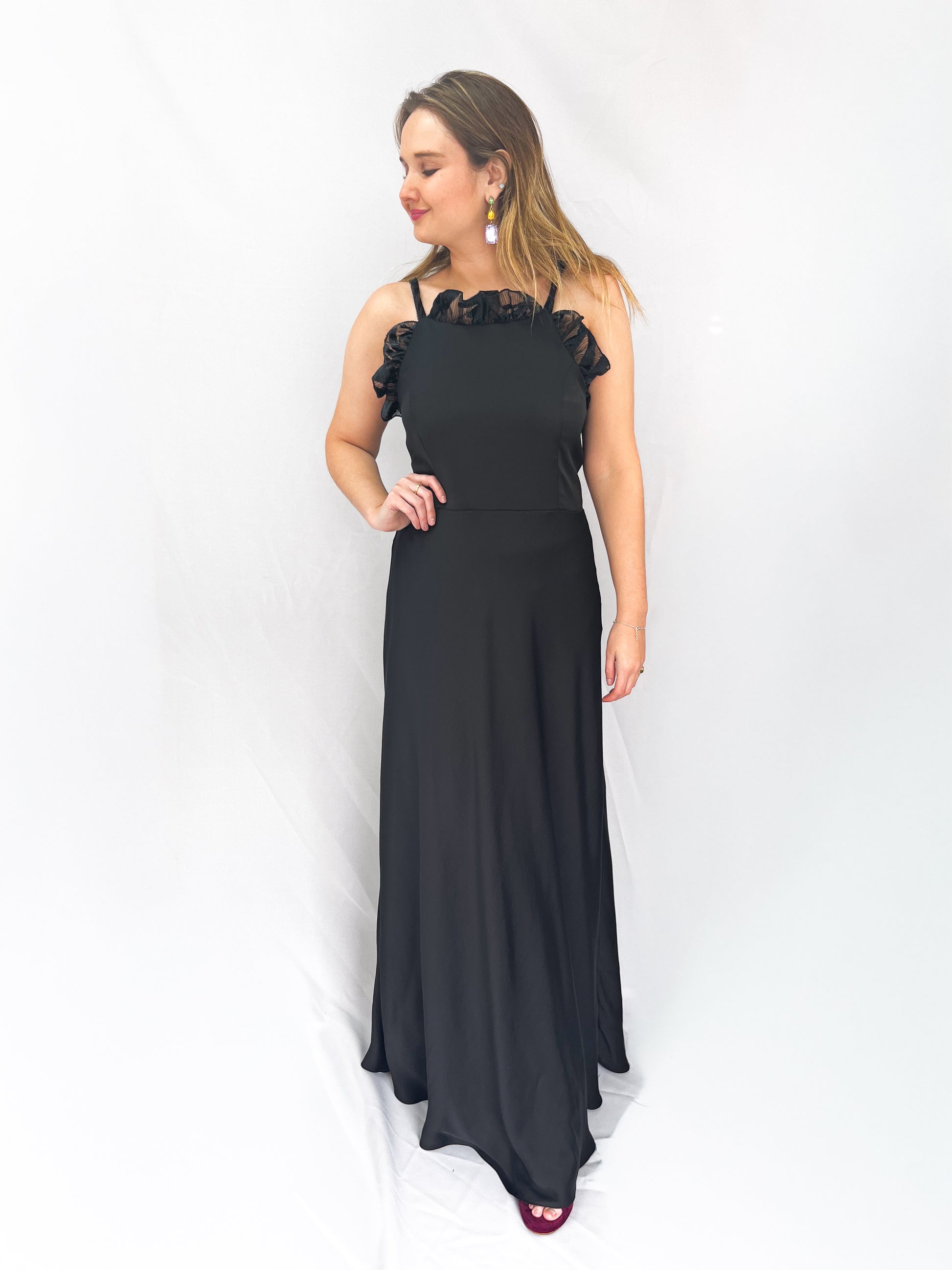 El Vestido Mallorca es un diseño largo con escote halter y delicados vuelos en el escote, pensado para acompañar a mujeres reales en sus momentos más especiales. Su caída fluida y elegante lo convierte en una opción ideal como vestido de invitada de matrimonio o para distintos eventos.
