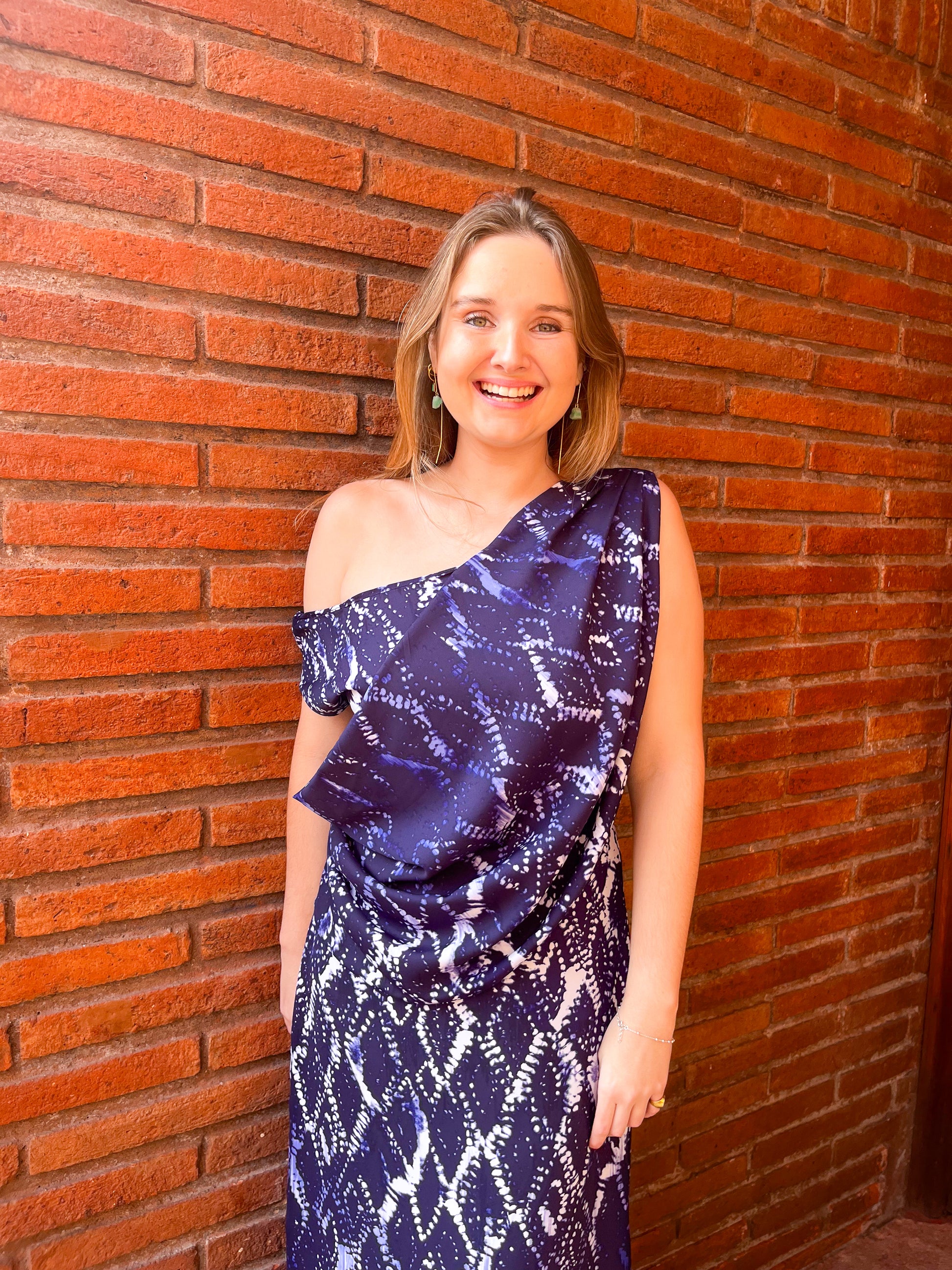 Vestido largo con escote al hombro y caída drapeada que estiliza tu figura. Confeccionado en satén con print geometrico tonos azules, tiene una abertura lateral que da movimiento y un toque sexy sin exagerar. Perfecto para eventos de noche donde quieres verte distinta, elegante y personalidad.