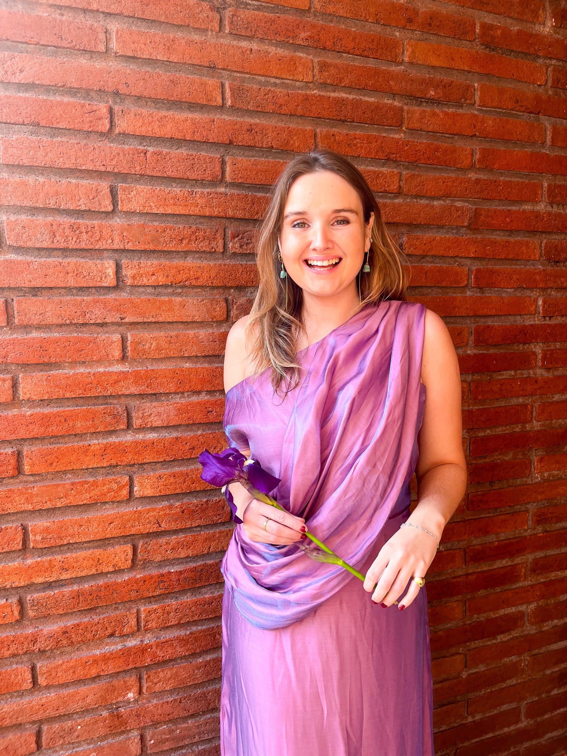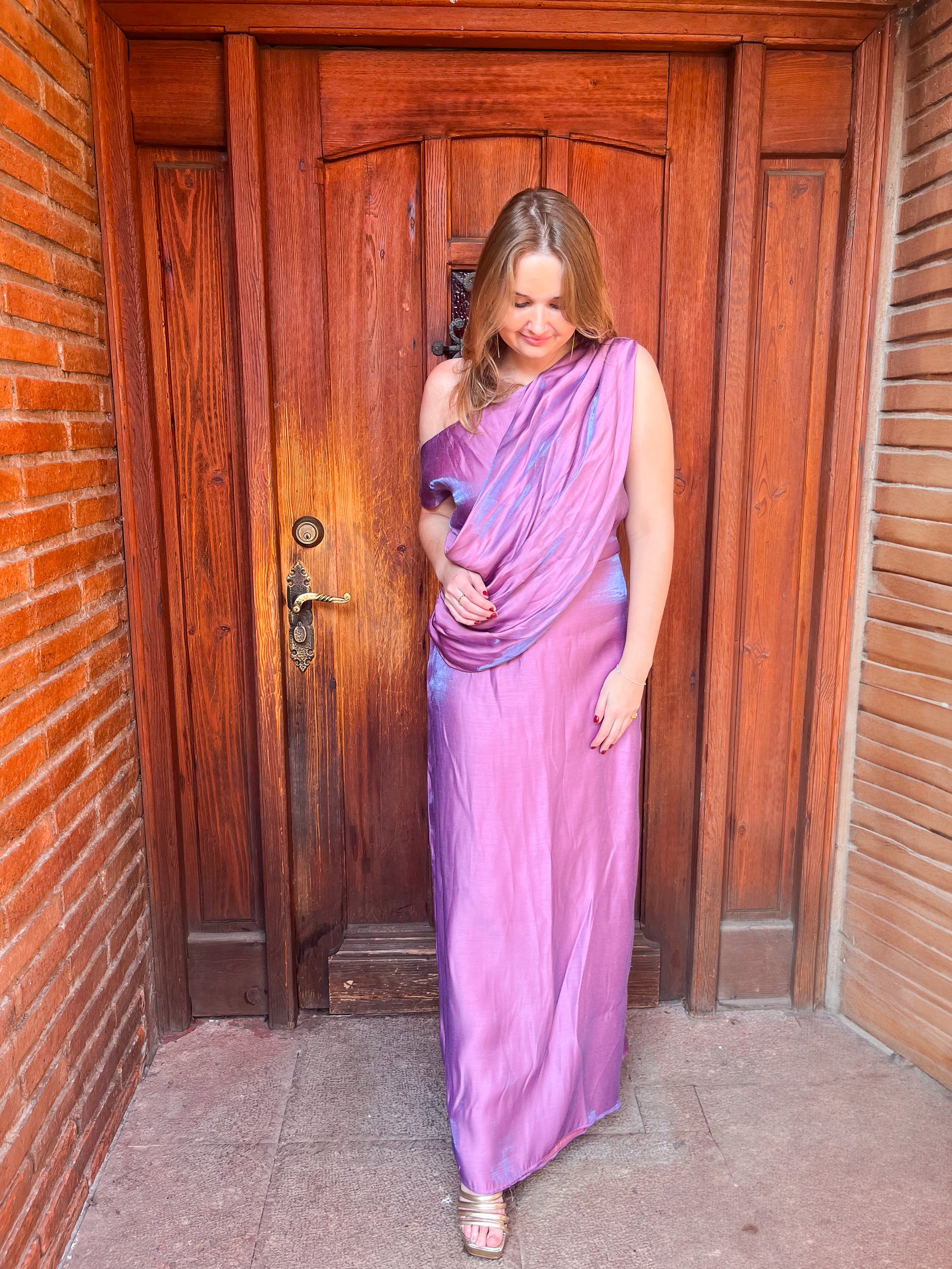 Vestido largo con escote al hombro y caída drapeada que estiliza tu figura. Confeccionado en rosado tornasol con efecto arrugado, creando un look único, tiene una abertura lateral que da movimiento y un toque sexy sin exagerar. Perfecto para eventos de noche donde quieres verte distinta, elegante y personalidad.