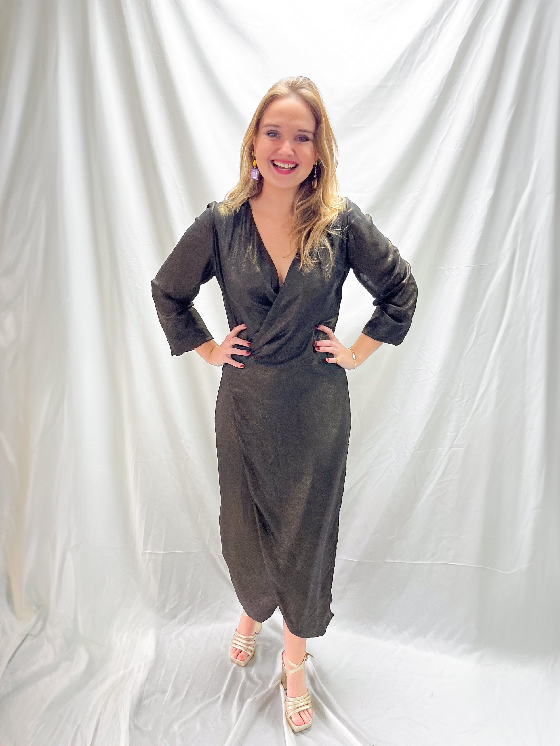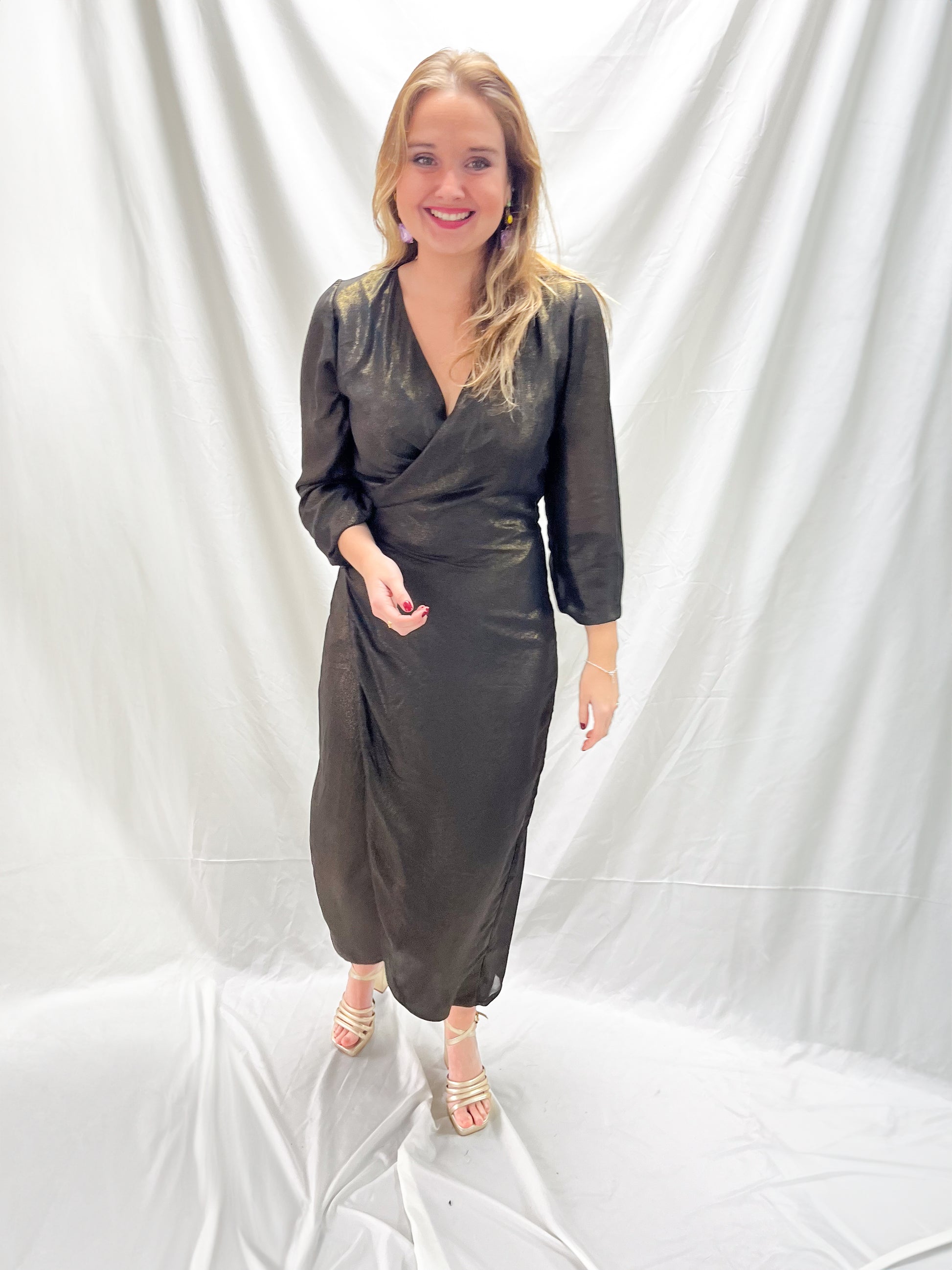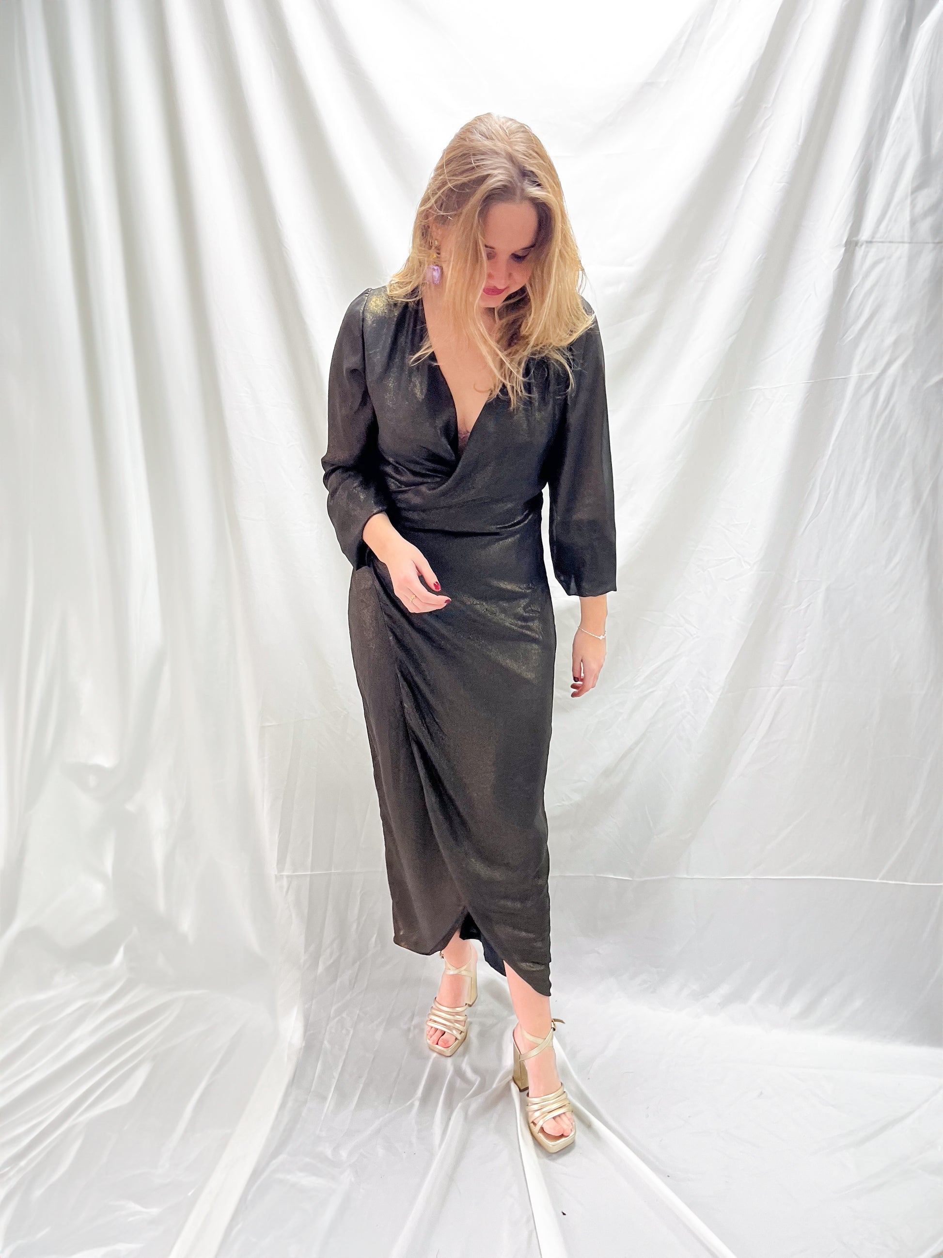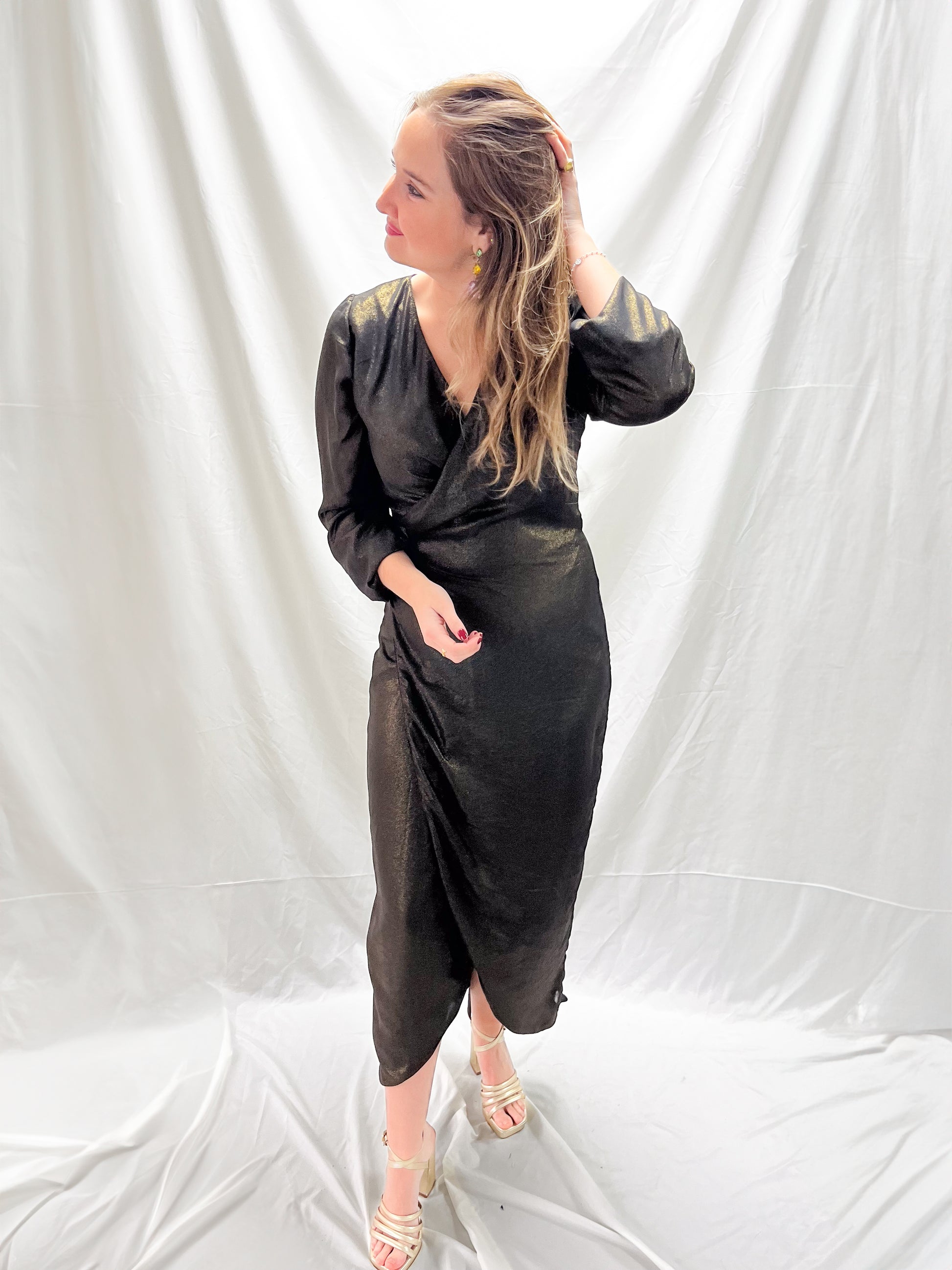 El Vestido Praga es un clásico moderno: un diseño envolvente y ajustable que se adapta a tu silueta con fluidez y elegancia. Su largo midi y mangas largas lo convierten en una opción versátil, ideal tanto para eventos de día como para celebraciones de noche, cenas formales o incluso como outfit elegante de oficina. Vestido negro con brillos dorados.