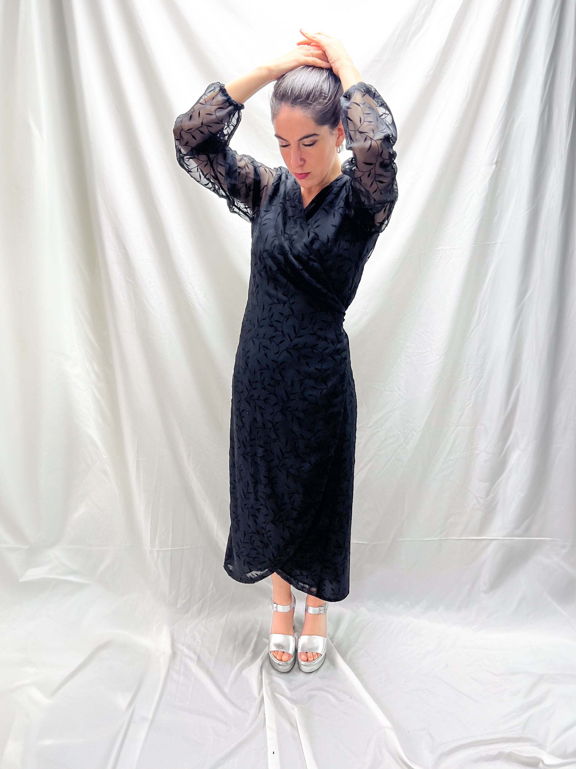 El Vestido Praga es un clásico moderno: un diseño envolvente y ajustable que se adapta a tu silueta con fluidez y elegancia. Su largo midi y mangas largas lo convierten en una opción versátil, ideal tanto para eventos de día como para celebraciones de noche, cenas formales o incluso como outfit elegante de oficina. Estilo gasa negra con diseño.